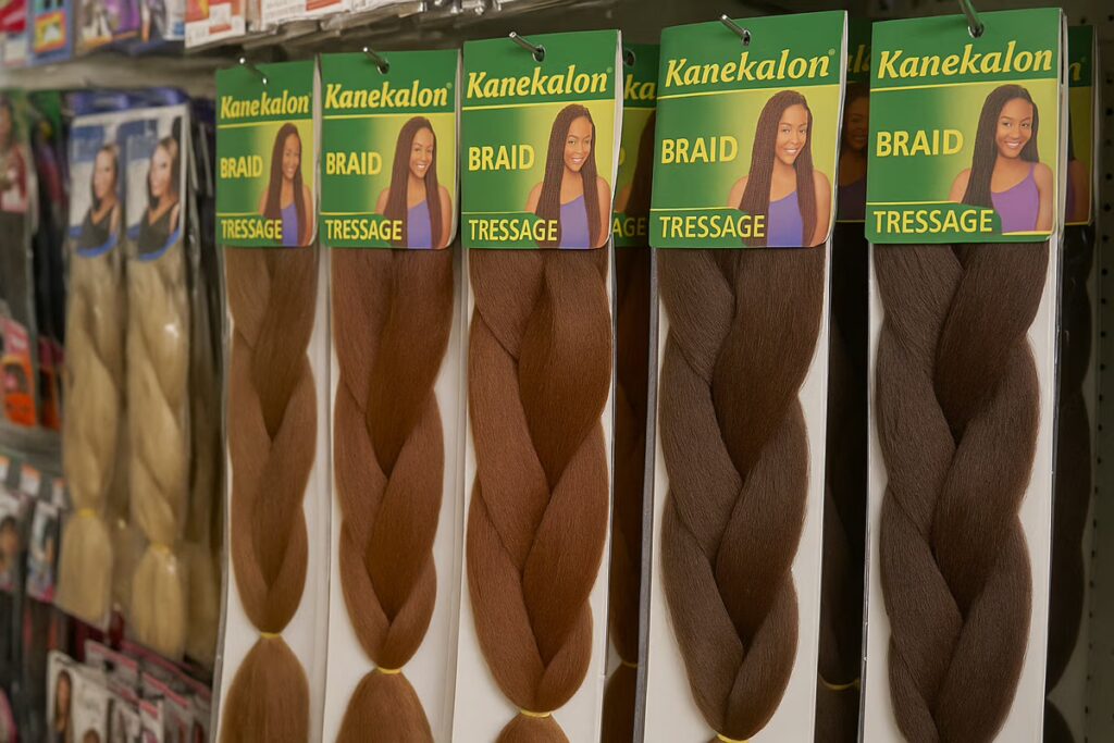 La majorité des cheveux à tresser vendus dans le commerce de masse sont fabriqués à partir de fibres plastiques dites de type Kanekalon ou Toyokalon. Ces fibres sont très appréciées pour leur prix abordable, leur apparence proche du naturel et leur facilité de coiffage. Pour atteindre ces qualités, les fabricants enduisent ces fibres d’un mélange complexe de produits chimiques :